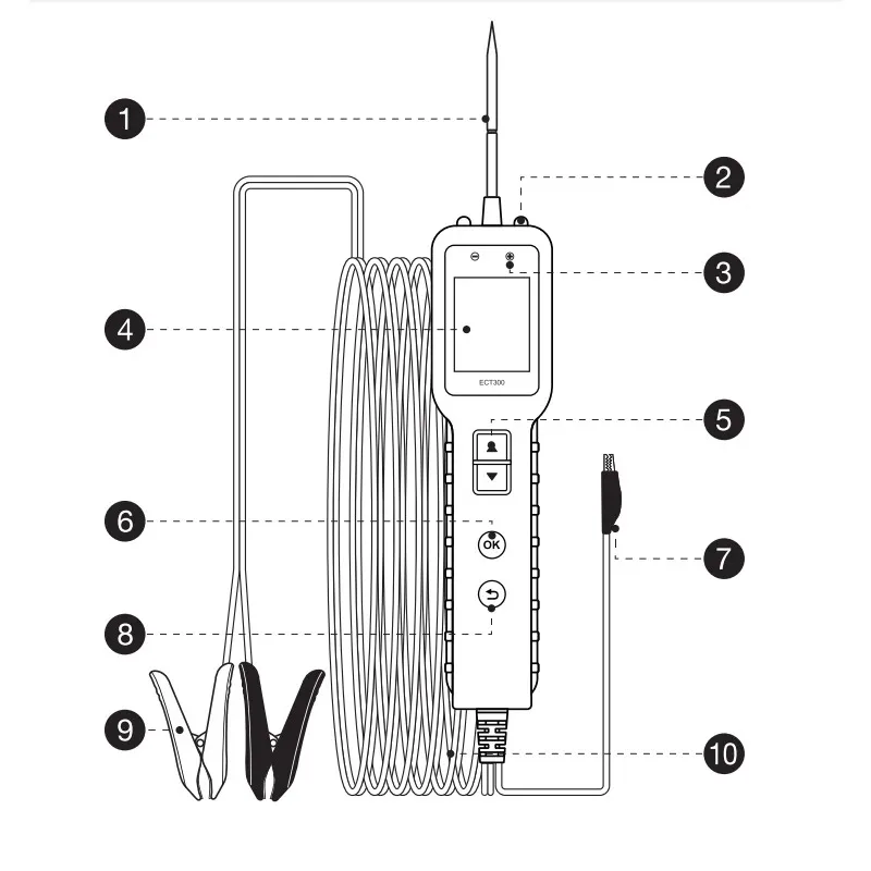 1. 【Práctica prueba de circuito automotriz】 KINGBOLEN ECT300 puede detectar rápidamente cortocircuitos y cables rotos en los componentes del sistema eléctrico del vehículo.Es multifuncional, incluida la prueba de voltaje/activación de componentes (activación de faros, ventiladores, etc.)/Prueba de continuidad/Detección de tierra/seguimiento y cortocircuito/Detección de polos positivo y negativo y detección de diodos.